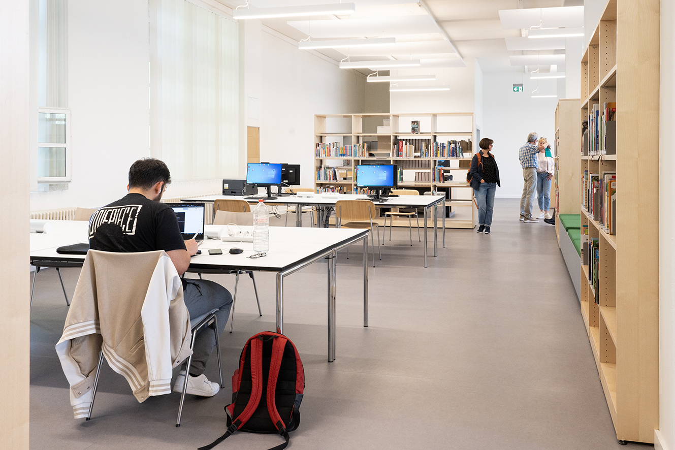 - kostenlose Internetplätze, freies WLAN und viele Arbeitsplätze mit Steckdosen laden zum Lernen und Recherchieren ein